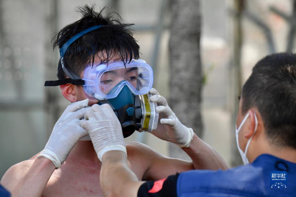 9月20日,在厦门市同安区新民镇乌涂社区,参与疫情防控消杀工作的厦门曙光救援队志愿者工作后脱去面罩。
