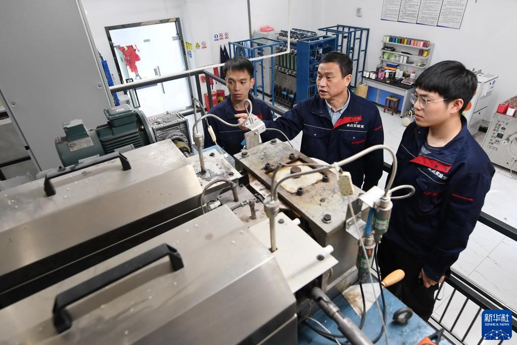 福建闽江学院服装与艺术工程学院教授李永贵(中)在“福建省新型功能性纺织纤维及材料重点实验室”教学生做纺丝实验(3月22日摄)。