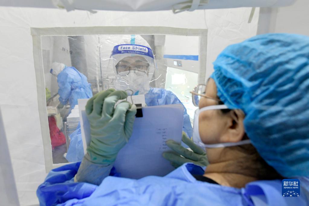 9月25日,在位于巴彦县的黑龙江省疾控中心移动方舱核酸检测实验室,工作人员在交流。