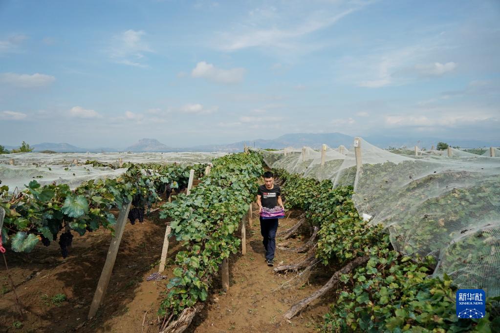 金秋时节,河北省涿鹿县8万余亩葡萄成熟上市。在桑干河畔的种植基地内,葡萄枝头硕果累累,当地农民利用晴好天气开展采收作业。