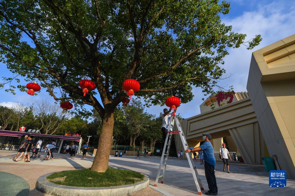 9月26日,朱家尖南沙景区的工作人员在挂灯笼,为即将到来的国庆节增添喜庆气氛。