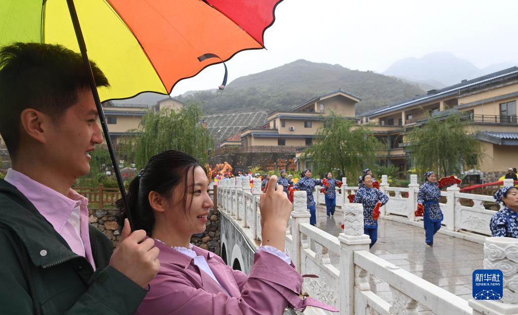 游客在龙渠沟有机社区观看当地村民表演的舞台剧(9月25日摄)。