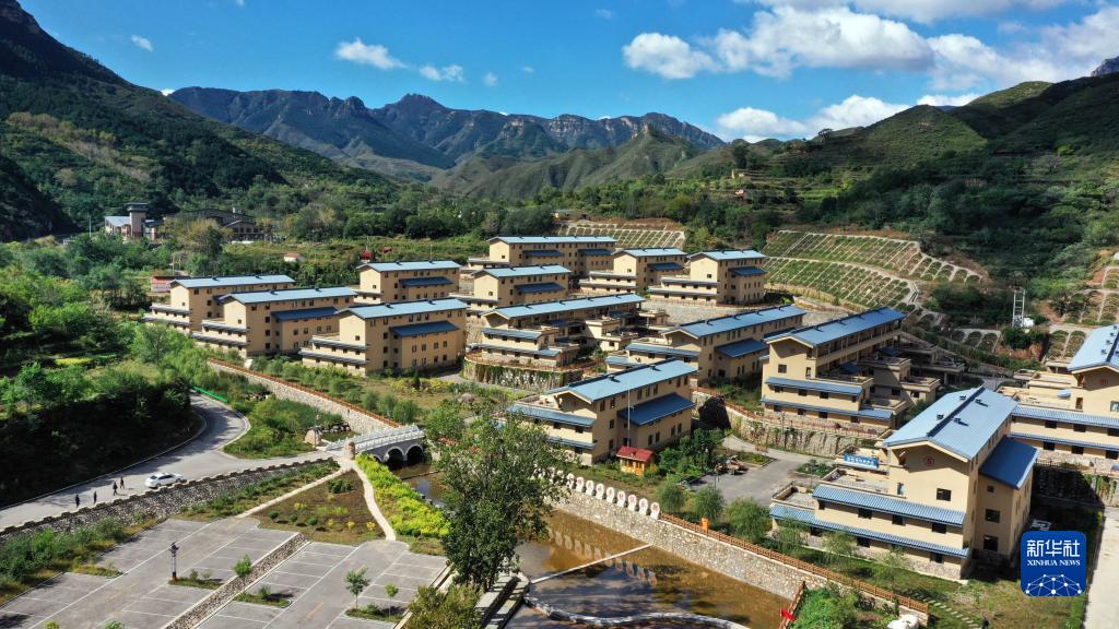 灵丘县龙渠沟有机社区的楼房掩映在青山绿树间(9月23日摄,无人机照片)。