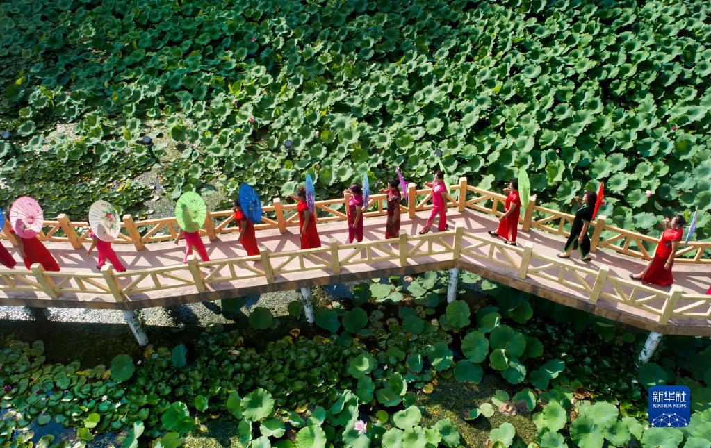 红石塄乡北泉村村民在荷花节上为游客表演旗袍秀(8月26日摄)。