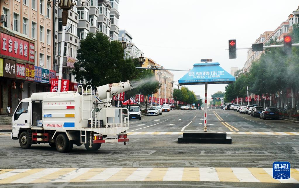 在巴彦县巴彦镇的街路上,消杀车辆在进行消杀作业(9月26日摄)。