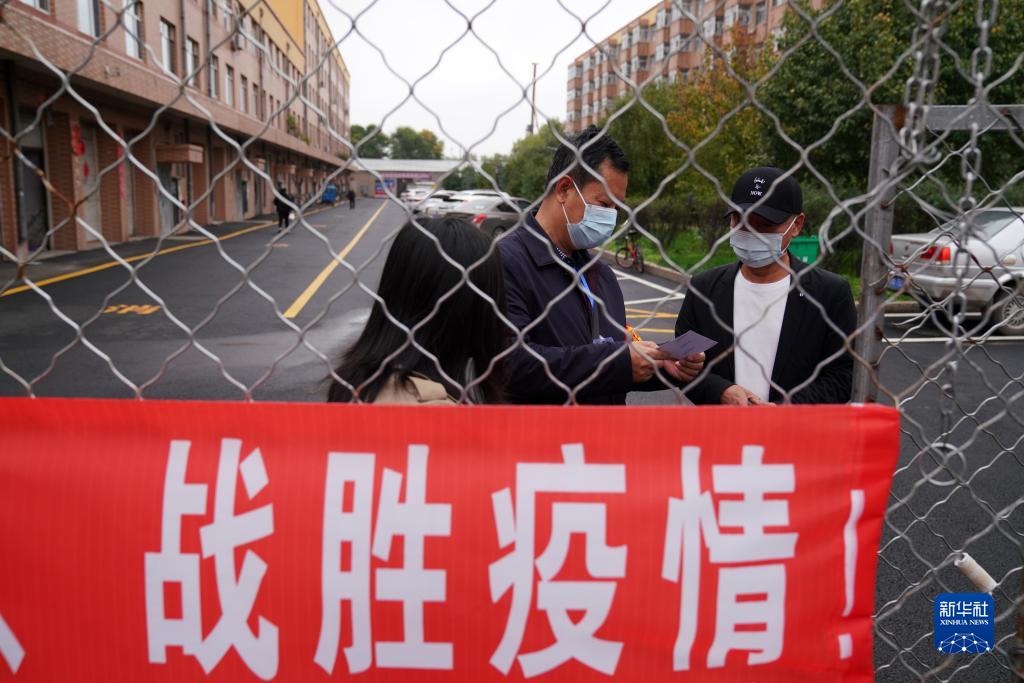 在巴彦县巴彦镇一小区的卡点,工作人员在查验外出工作居民(右)的证明(9月26日摄)。