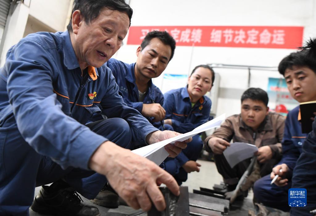 6月17日,艾爱国(左一)在湖南湘潭湘钢高级技工学校焊接实习基地检查学生的焊接作业。