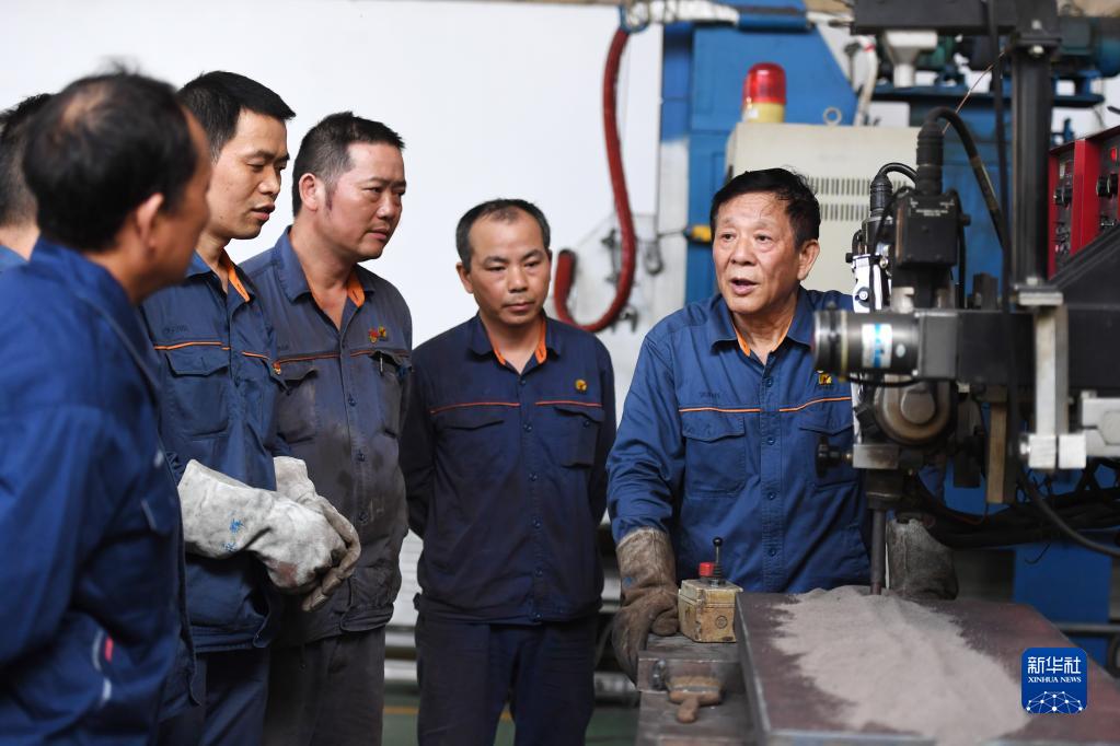 6月12日,艾爱国(右一)在湖南华菱湘潭钢铁有限公司实验室和同事探讨焊接技术。