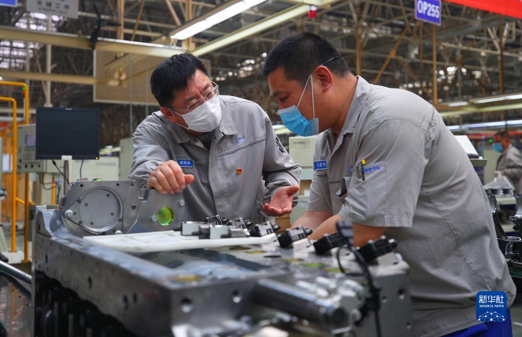 一汽解放大连柴油机有限公司的高级技师鹿新弟(左)在车间与同事交流(2020年5月7日摄)。