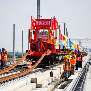 9月27日,中铁四局工人在京唐城际铁路铺轨现场作业。新华社记者 牟宇 摄