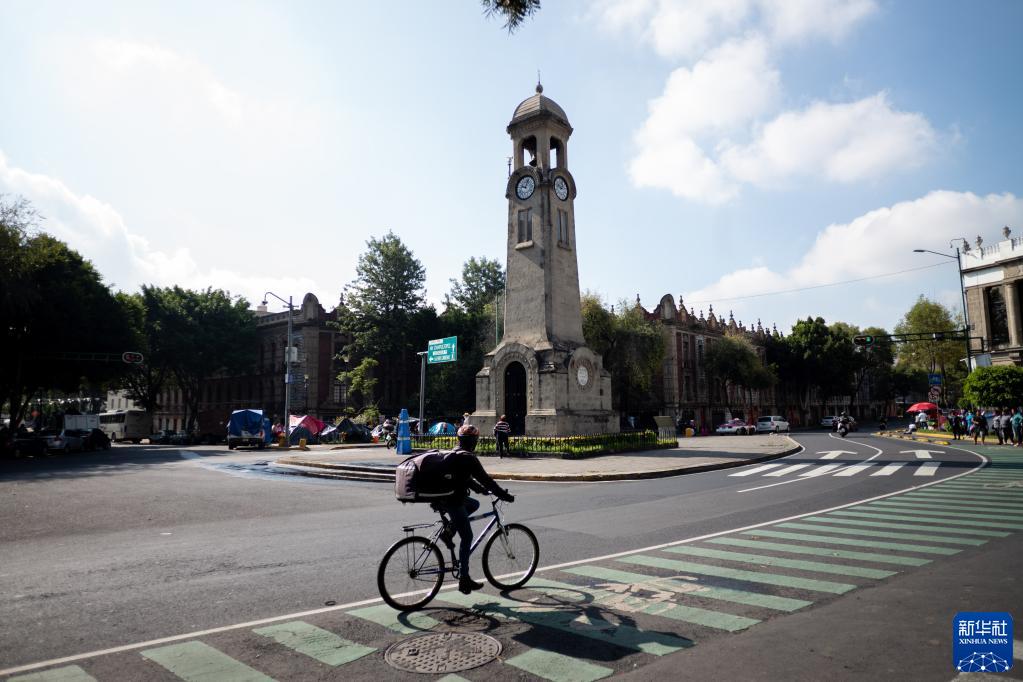 9月27日,在墨西哥首都墨西哥城,一名男子骑车驶过中国钟。