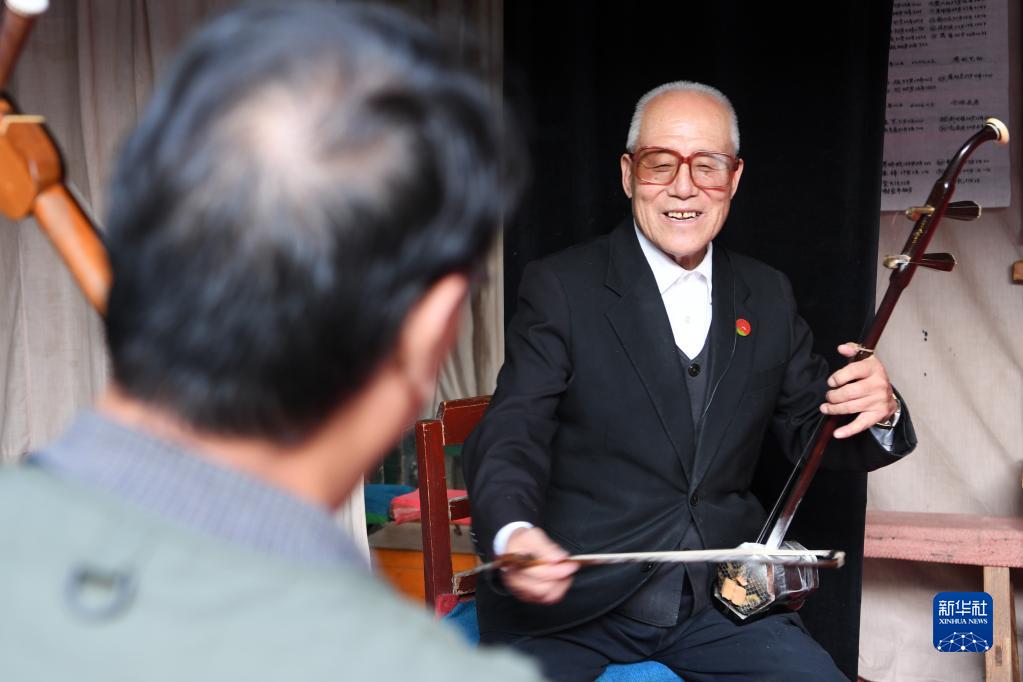 9月6日,在定西市安定区家中,刘福(右)表演自编自导的戏剧《圆洮梦》片段。新华社记者 范培珅 摄