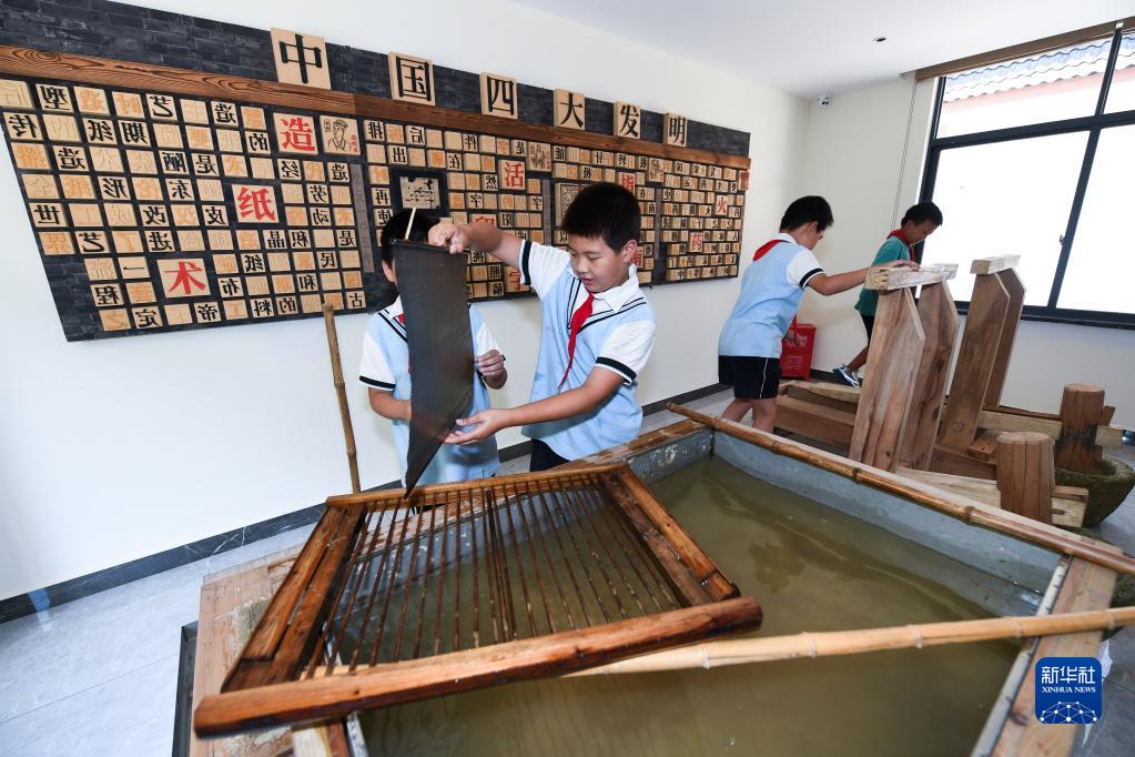 9月28日,小学生在湖源乡新二村的元书纸文化体验馆内体验手工元书纸的制作。