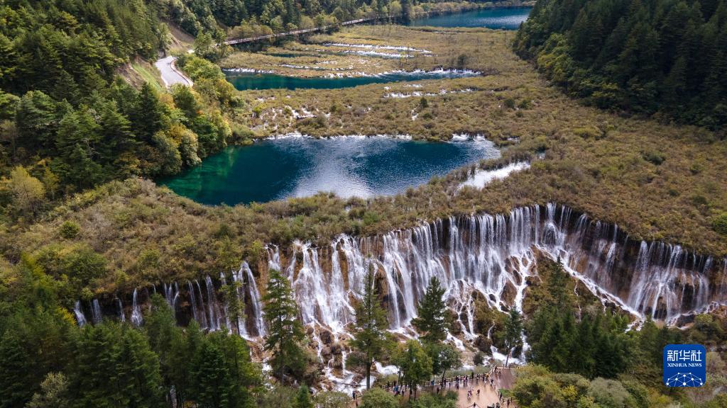 这是9月27日在四川省九寨沟景区拍摄的诺日朗瀑布(无人机照片)。