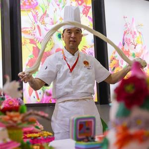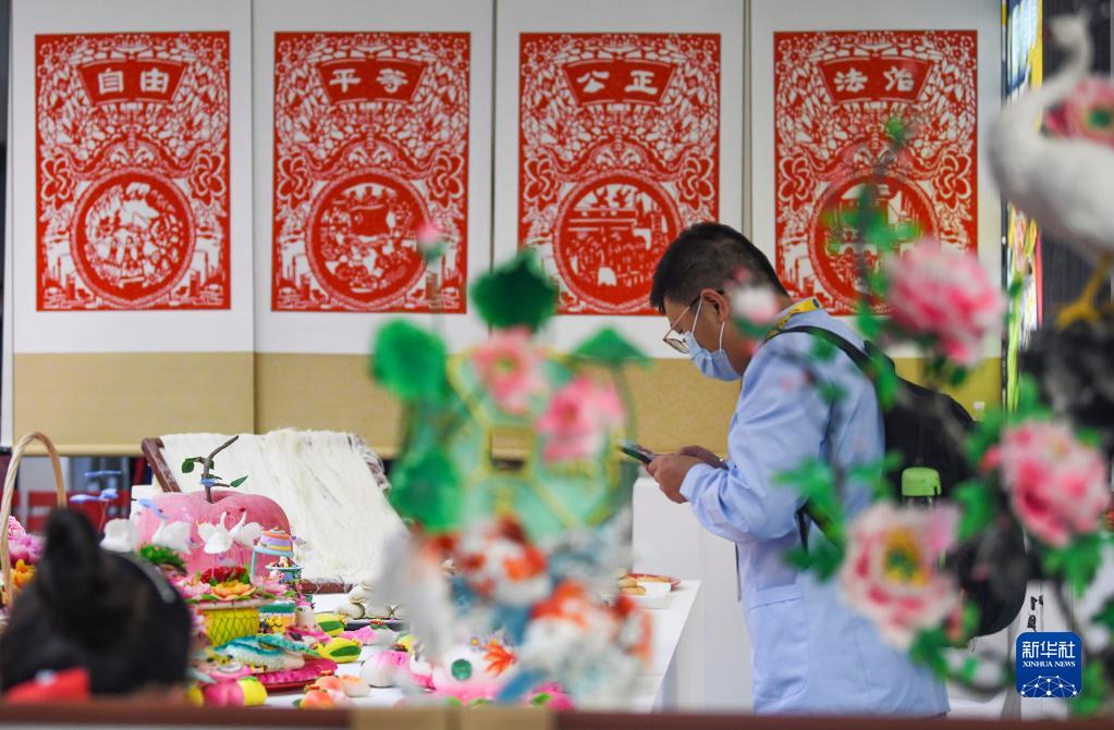 在“技能中国行2021——走进新疆”技能展示交流活动山东展示区,参观者在拍摄展出的花饽饽(9月27日摄)。