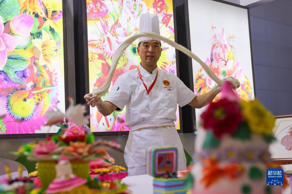 在“技能中国行2021——走进新疆”技能展示交流活动山东展示区,面点技艺传承人在展示中式面点技艺(9月26日摄)。