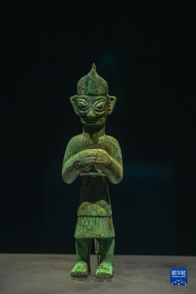 这是9月28日在“山高水阔 长流天际——长江流域青铜文明特展”上拍摄的三星堆遗址出土的“铜小立人”。