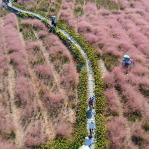 9月28日,游客在龙门古镇外的粉色花海中拍照留影(无人机照片)。
