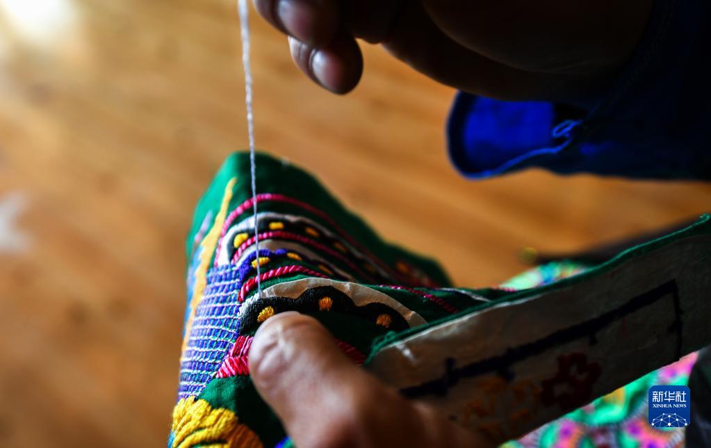 9月28日,在贵州省黔东南苗族侗族自治州榕江县兴华水族乡摆贝村,榕江县非物质文化遗产苗族服饰文化代表性传承人潘老拉在刺绣。