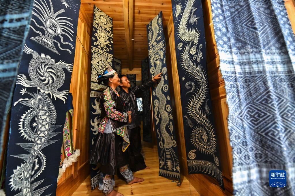 9月28日,在贵州省黔东南苗族侗族自治州榕江县兴华水族乡摆贝村,榕江县非物质文化遗产苗族服饰文化代表性传承人潘老拉(左)与丈夫在探讨传统蜡染图案纹样。