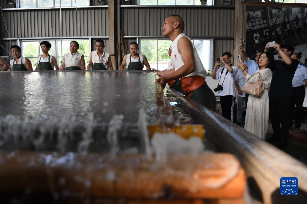 9月28日,在“超级宣纸”生产车间,工人进行捞纸作业。