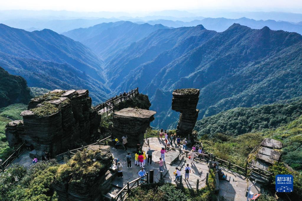 9月27日,游客在贵州省铜仁市梵净山景区旅游观光(无人机照片)。