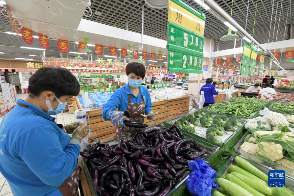 在哈尔滨市巴彦县一大型超市,工作人员拣选居民线上下单购买的蔬菜(9月27日摄)。