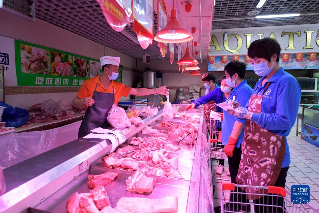 在哈尔滨市巴彦县一大型超市,工作人员拣选居民线上下单购买的肉类(9月27日摄)。