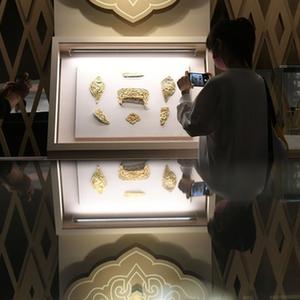 9月28日,观众在内蒙古文物菁华展上参观龙凤纹金鞍饰。