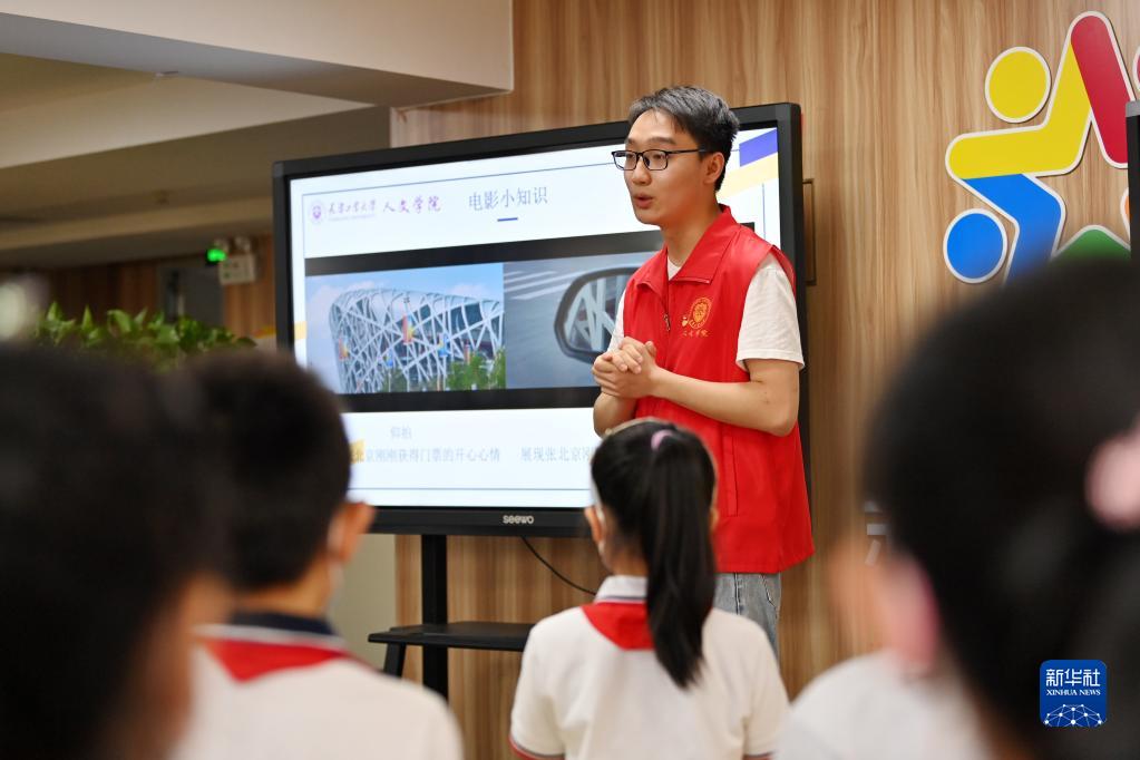 9月28日,在天津市和平区新星小学,天津工业大学人文学院的学生志愿者在讲解电影小知识。
