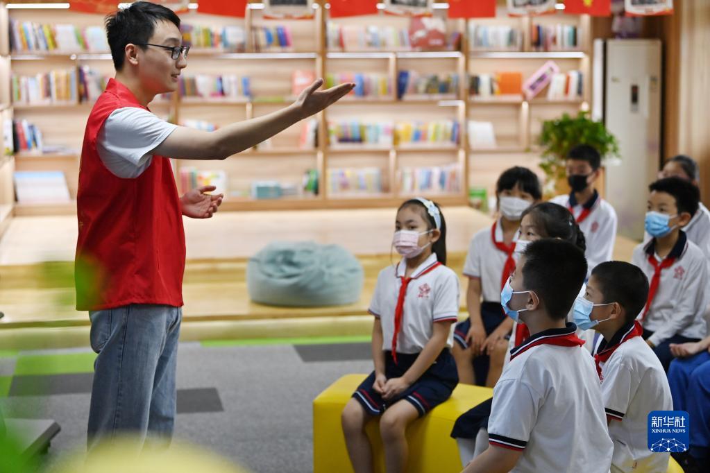 9月28日,在天津市和平区新星小学,天津工业大学人文学院的学生志愿者在和小学生互动。