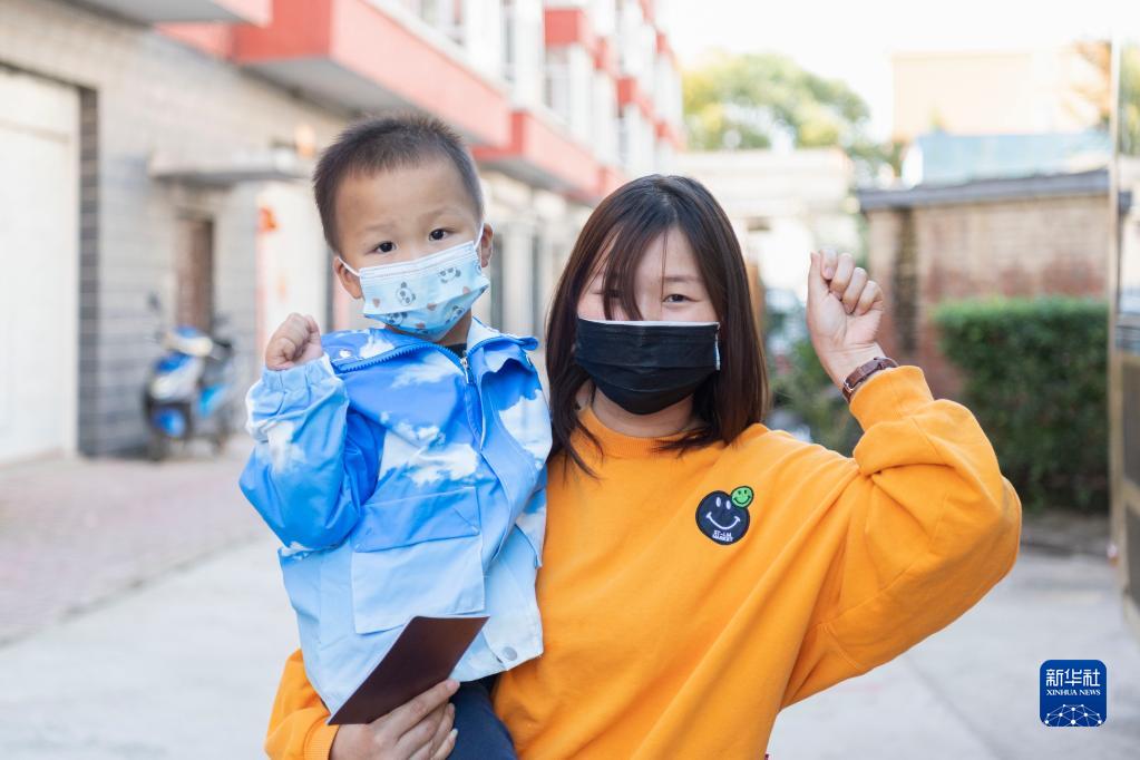 在哈尔滨市巴彦县兴隆镇一处流动核酸检测点外,居民在进行核酸检测采样后比手势加油鼓劲(9月24日摄)。