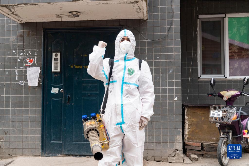 在哈尔滨市巴彦县一小区,巴彦县志愿者协会的志愿者在用弥雾机对小区进行消杀后比手势加油鼓劲(9月25日摄)。