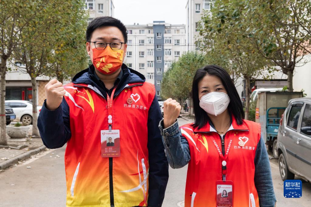 在哈尔滨市巴彦县一小区,巴彦县志愿者协会的志愿者比手势加油鼓劲(9月25日摄)。
