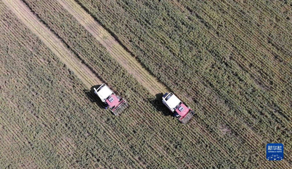 9月29日,河北省邢台市南和区三思镇一家农民专业合作社的农民驾驶收割机收获谷子(无人机照片)。