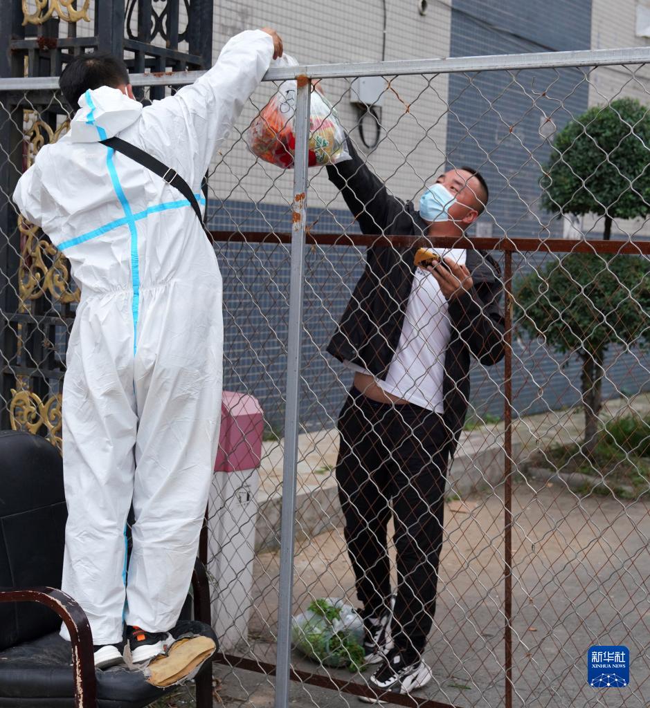 在巴彦县一小区门口,李阳(左)将配送的物品递入居民手中(9月26日摄)。