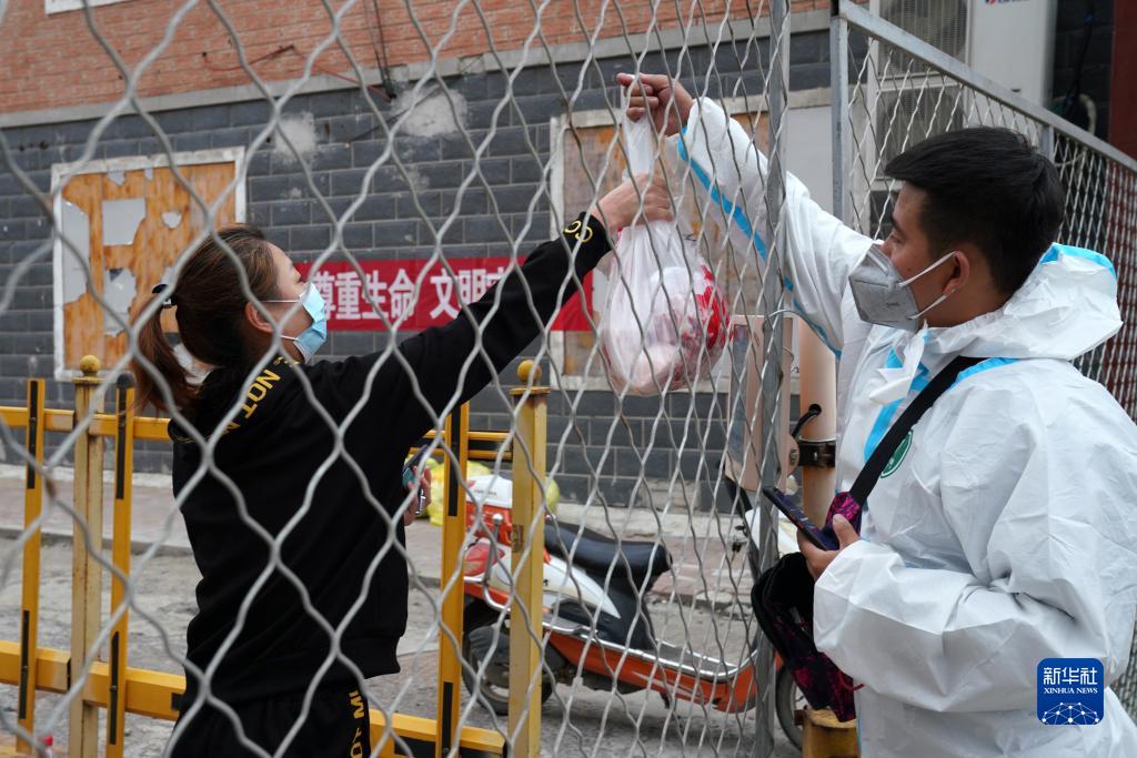 在巴彦县一小区门口,李阳(右)将物品递给居民(9月26日摄)。
