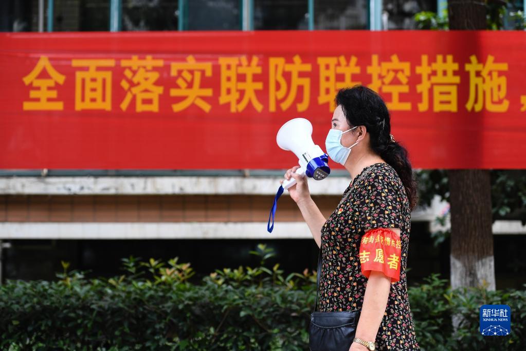8月10日,在南京市建邺区南苑街道吉庆家园小区,志愿者马维珍提示下楼活动的居民不要聚集扎堆。