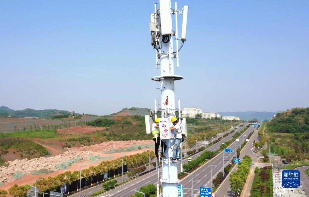 工作人员在位于重庆高新区高新大道的5G基站建设现场作业(2020年4月15日摄,无人机照片)。