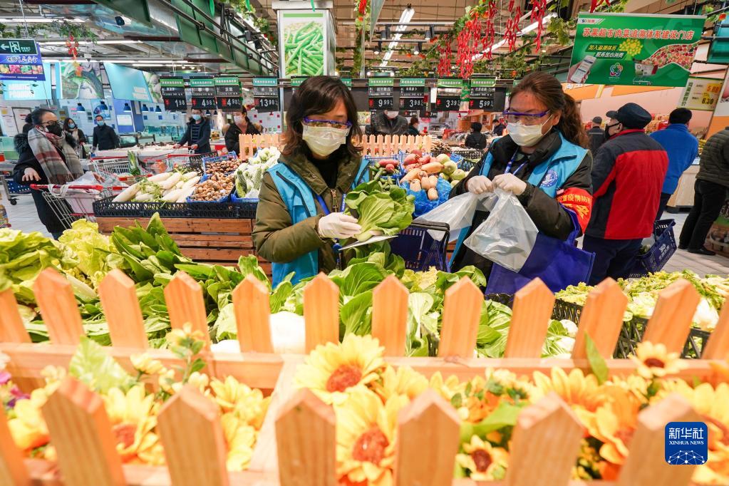 南京市建邺区南苑街道兴达社区的网格长范璐(左)和同事在超市为辖区内居民代购蔬菜(2020年2月17日摄)。
