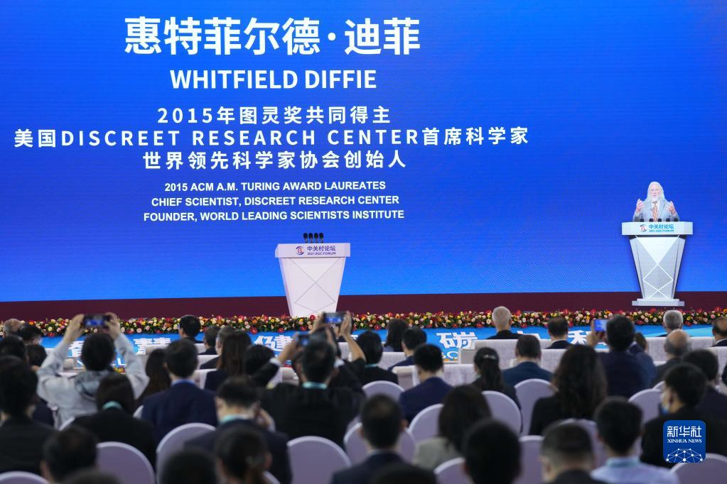2015年图灵奖共同得主惠特菲尔德·迪菲在2021中关村论坛全体会议上视频致辞(9月25日摄)。新华社记者 鞠焕宗 摄