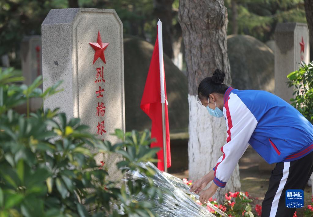 9月30日,在沈阳抗美援朝烈士陵园,学生向杨根思烈士墓献花。新华社记者 杨青 摄