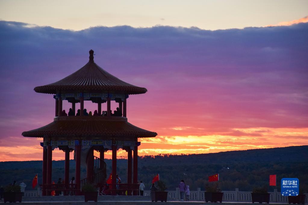 10月1日,在“中国东极”黑龙江省抚远市,游客在东极广场上观赏日出。