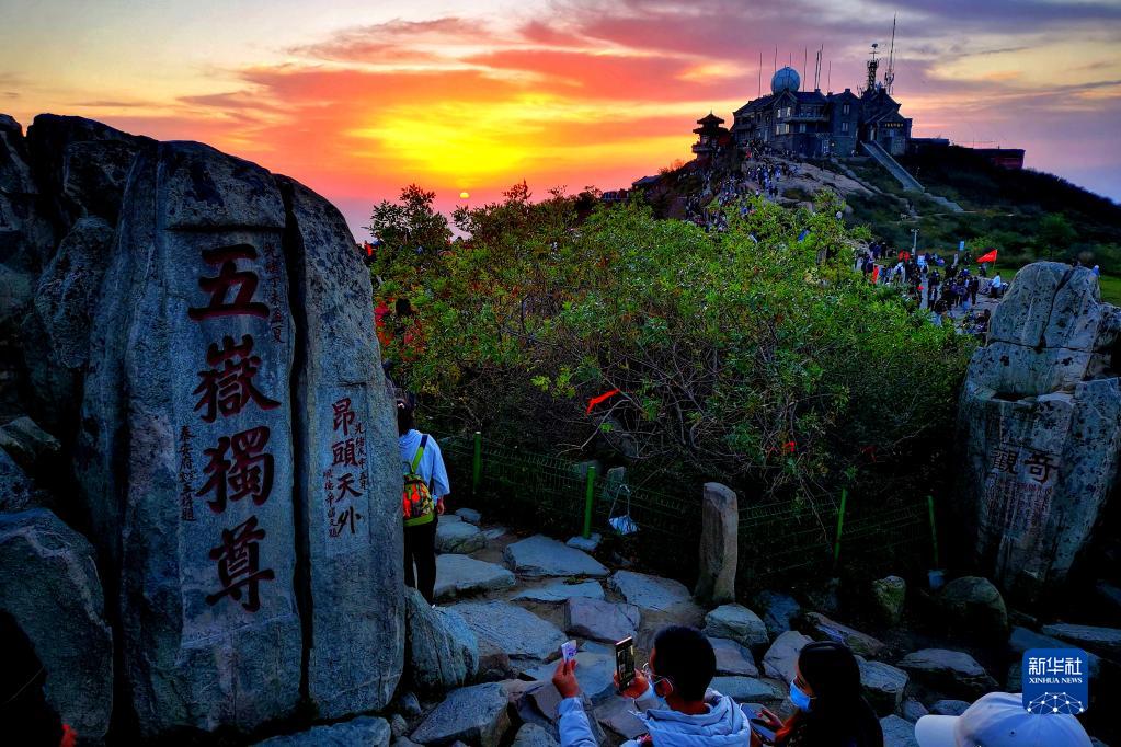 这是10月1日拍摄的日出时分的山东泰山。
