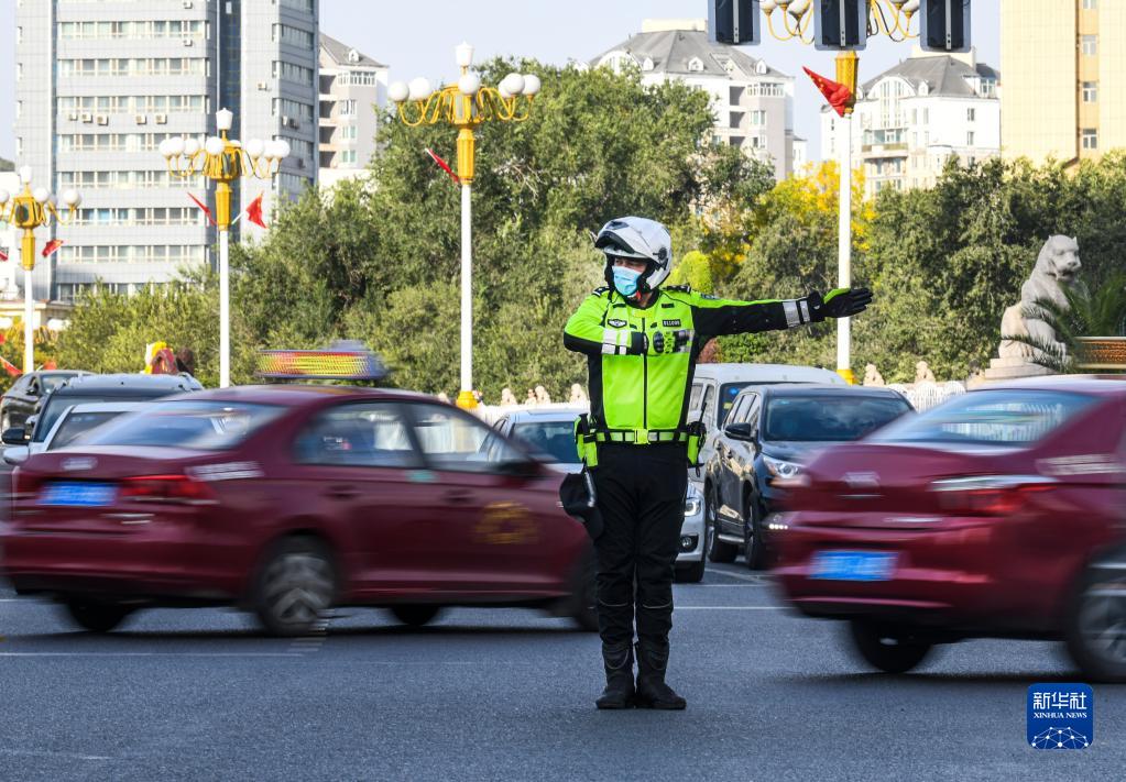 10月1日,乌鲁木齐市公安局交通警察支队民警艾日夏提·阿不力肯木在西大桥执勤点指挥交通。
