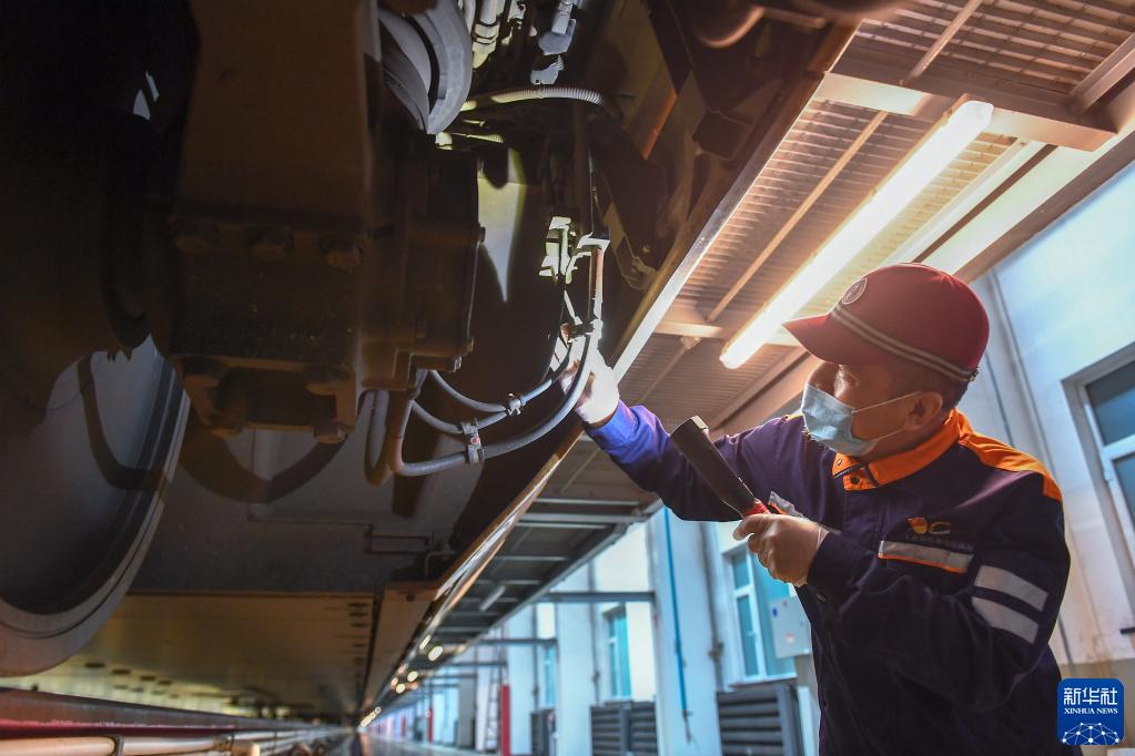 10月1日,信号工贺海龙在长春动车运用所检查车下设备。