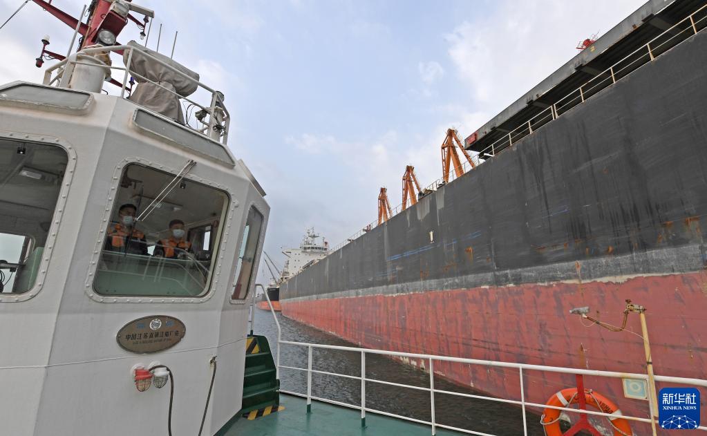 10月1日,天津港轮驳有限公司船长马国利(右)驾驶拖轮协助出港船舶进行离泊作业。