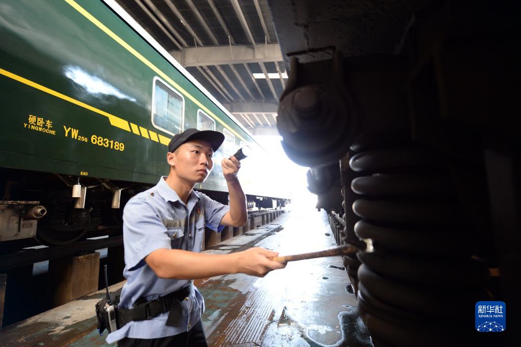 10月1日,广铁集团长沙车辆段的检车员在检修列车。
