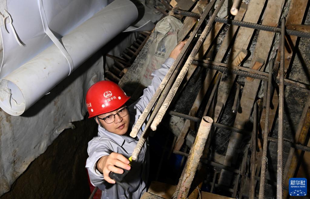 10月1日,在陕西西安地铁八号线丰禾路站施工现场,中铁七局的工作人员在测量车站顶纵梁钢筋锚固长度。