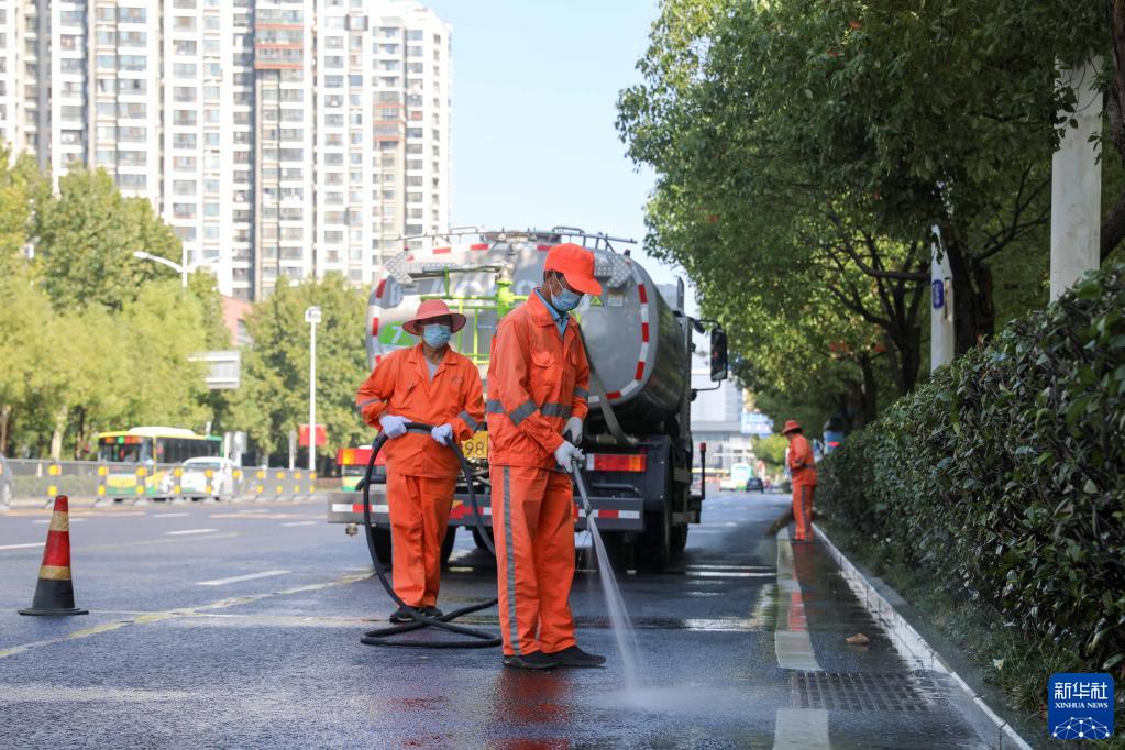 10月1日,合肥市包河区环卫工人在清洁路面。